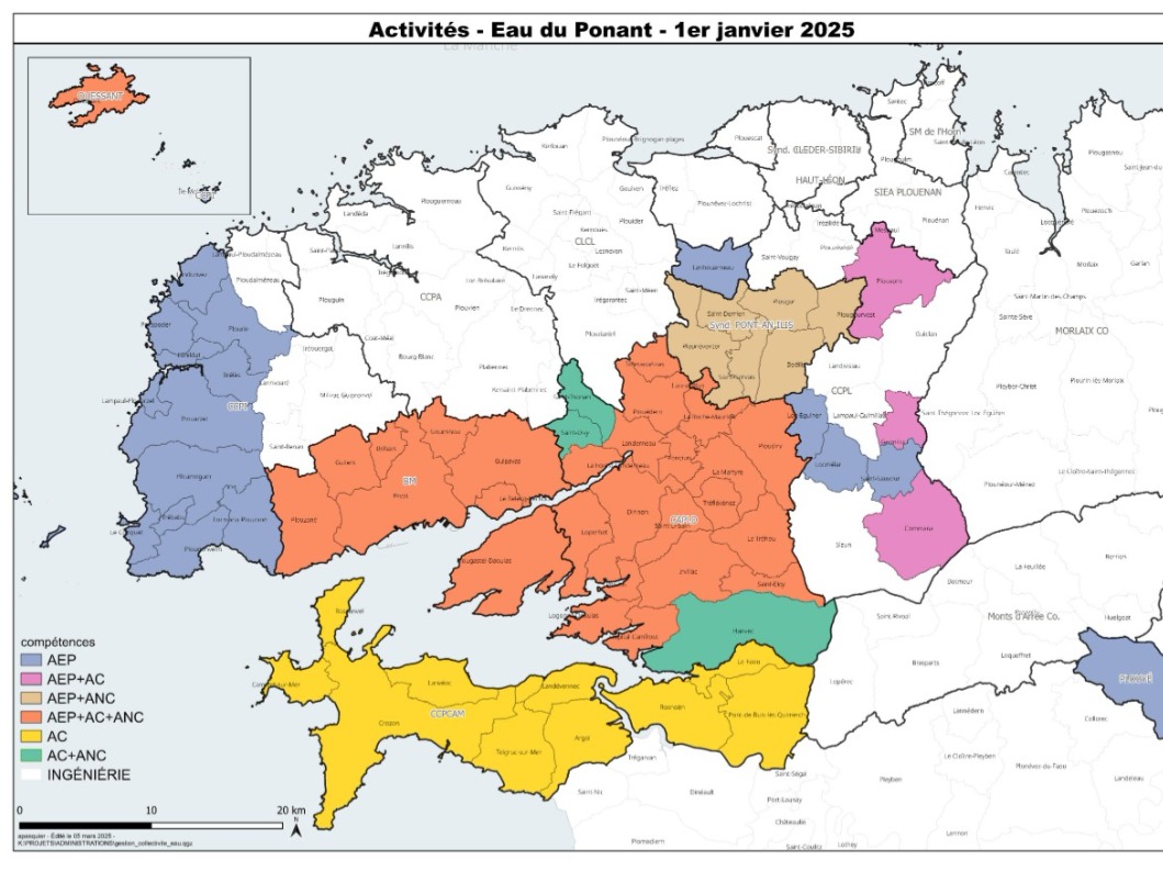 L'assainissement non collectif est géré par Eau du Ponant sur les territoires en marron, en rouge et en vert.